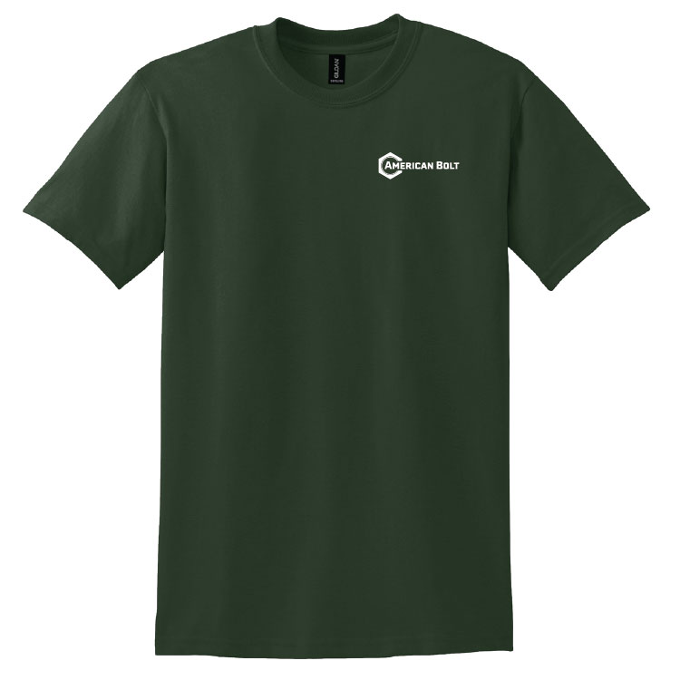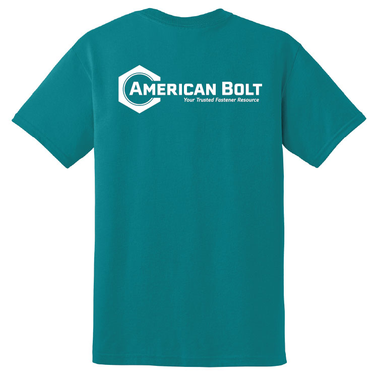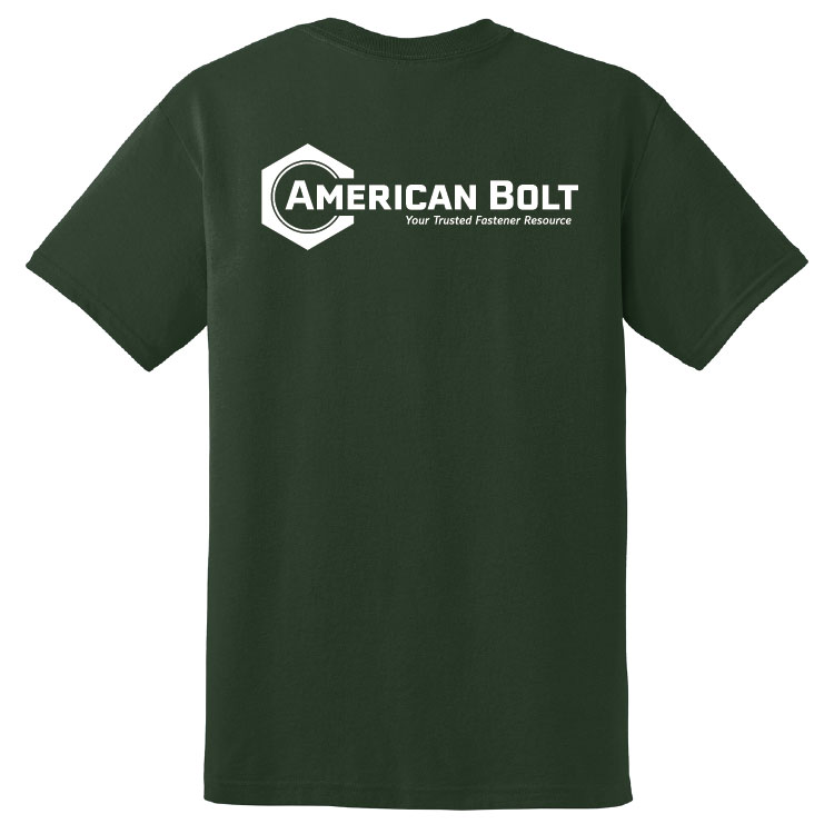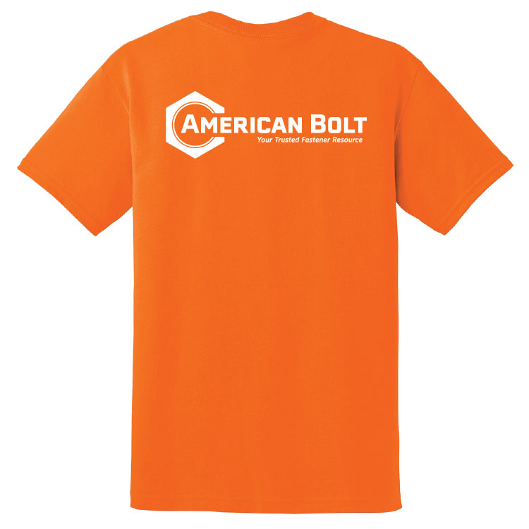 - American Bolt logo with tagline screen printed on back (Black on safety green, full color on sand, white on Texas orange,black, jade dome, forest green, and safety orange)